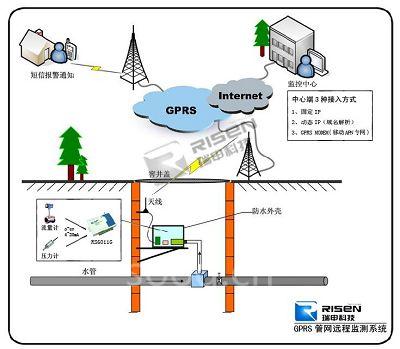 管網(wǎng)監(jiān)控點:各監(jiān)控點通過數(shù)據(jù)采集模塊采集如壓力、流量等數(shù)據(jù),通過RS232(RS485)接口與GPRS透明數(shù)據(jù)傳輸終端相連,無標準通訊接口的設備,也可以采用我公司帶有模擬量、開關量采集功能的RS6011G GPRS RTU。通過GPRS透明數(shù)據(jù)傳輸終端內(nèi)置嵌入式處理器對數(shù)據(jù)進行處理、協(xié)議封裝后發(fā)送到GSM網(wǎng)絡。