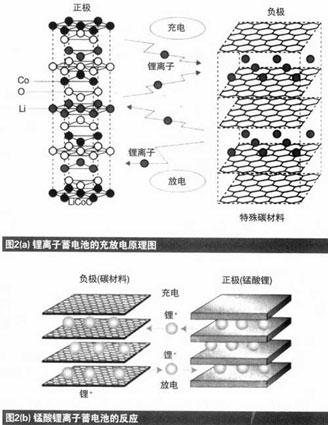 在鋰離子蓄電池中不使用諸如鉛酸蓄電池或鎳氫蓄電池的水溶液電解液,而是使用有機電解液。在充電過程中,正極中的鋰呈離子狀態(tài),在電解液中移動,并被負極中的碳物質吸附。放電則是充電過程的逆反應。在這種反應過程中,通常鋰以離子形態(tài)存在,不析出金屬狀態(tài)的鋰。圖2(a、b)表示鋰離子蓄電池工作原理圖。