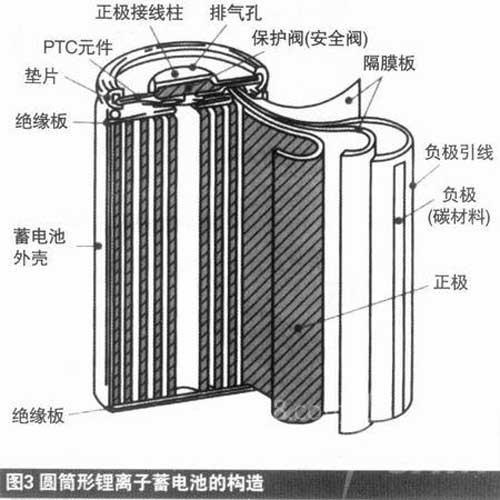 以圓筒形鋰離子蓄電池為例(見圖3)。表面涂有活性物質的正負極與隔板組成的組件插入金屬制電槽內。