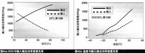 圖4示出常溫下的充電狀態(tài)(SOC)與輸入、輸出的功率密度的關系。由圖可知,當充電狀態(tài)低時,電流輸出功率小,但大于鎳氫蓄電池相應值。而充電時,則呈負相關關系,即SOC升高,輸入電流明顯下降。即使這樣,其實際量值與其它蓄電池相比還維持較大值。參見圖4(a)。圖4(b)表示溫度與輸入、輸出功率密度的關系。與其它種類蓄電池一樣,充放電功率溫度越低,其量值越小。這是因為在低溫下電解液的粘度增大,離子移動速度變慢的緣故。