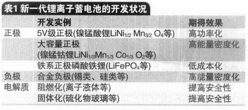 鈷酸鋰作為正極,碳材料作為負極的鈷酸鋰離子蓄電池自1994年問世以來已經經過14年時間。在這期間進行了多次改進,能量密度超過了最初的二倍(單位重量能量密度達到200Wh/kg,單位溶積也達到了500Wh/dm3。這已經接近初期鋰離子蓄電池性能的極限。與此同時,由于鋰離子蓄電池的正負極都應用層間化合物之類的基質材料,又開發(fā)了新型基質材料,從而能實現(xiàn)鋰離子蓄電池的高功率化、高能量密度。表1表示當今正在開發(fā)的典型實例。其中,當應用大容量正極時,能量密度約提高30%,5V級正極場合,功率密度提高20—30%。另一方面,通過采用合金負極,有望使鋰離子蓄電池的能量密度提高到原來2—3倍。這些材料中的一部分通過與其他材料的混合形式已經開始應用,有望今后實用化。