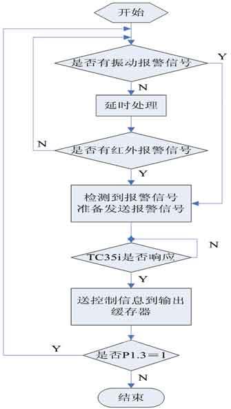 系統(tǒng)流程圖如圖4所示。主程序包括系統(tǒng)初始化、循環(huán)檢測(cè)。延時(shí)子程序用來產(chǎn)生一定的延時(shí),然后啟動(dòng)報(bào)警器以防止誤報(bào)警:主程序用來控制報(bào)警電路、短消息發(fā)送電路。當(dāng)單片機(jī)接收到中斷報(bào)警信號(hào)后由短信發(fā)送電路及時(shí)向車主發(fā)送報(bào)警消息。如果一切正常,程序處于循環(huán)等待中。