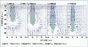 2所示的4張照片顯示了不同速度時(shí)刻燃油射束吸入空氣的情景(拍攝時(shí)間以共軌噴射系統(tǒng)噴射開(kāi)始時(shí)刻為準(zhǔn))。通過(guò)圖片可以清楚地看出:在一開(kāi)始時(shí),空氣被燃油噴射射束的尖峰向兩側(cè)排擠開(kāi)來(lái),然后形成一個(gè)復(fù)回流區(qū);在1400μs時(shí),照片中清楚地顯示出燃油射束最大的噴射深度;在距燃油噴射尖峰幾毫米處,空氣被垂直地吸入燃油射束中,燃油射束的直徑在距噴嘴大約25mm的位置處仍有所增加。