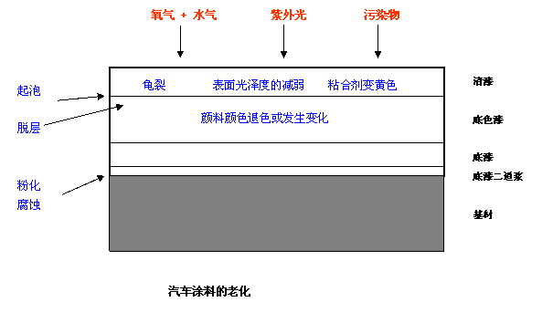 如下圖所示,一種典型的涂料系統(tǒng)包括老化過程中涂料系統(tǒng)的破壞現(xiàn)象。
