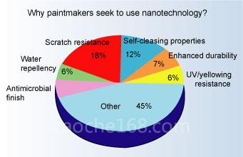 在接下來的數(shù)年內(nèi)我們能取得什么樣的成就呢?如圖所示,從事納米技術(shù)研究的涂料制造部門提出了當(dāng)前主流的一些觀點,接下來我們將分析 這些觀點;但是需要肯定的一點是,還有45%"其它"的應(yīng)用領(lǐng)域,對我們的工業(yè)部門來說,這意味著納米技術(shù)將會有更多的、令人感興趣的功能,對于這部分內(nèi)容我們將在本月的評論中進(jìn)行討論。