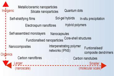 如下圖所示,對眾多不同類型的納米技術(shù)進(jìn)行一般性的歸類。由于材料尺度以及無機物含量等可以在一個更寬的范圍內(nèi)變化,因此這個圖不是太完整,不需要做深入的研究。