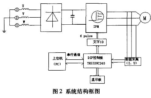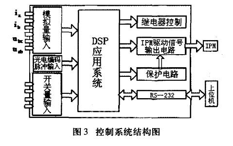 使用DSP作為控制器能最大限度地減少外圍器件的數目,增加系統(tǒng)的穩(wěn)定性。在本設計中主要使用1MS32OC24Ox DSP的PWM輸出口,及板上A/D口、捕獲接口CAP。DSP的6個PWM信號經過緩沖器反相后送到驅動電路板驅動IPM。控制系統(tǒng)結構圖如圖3所示