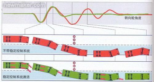 ESC的工作過程見上圖,當(dāng)車輛在低附著系數(shù)路面上避讓障礙物時(shí),不帶穩(wěn)定性控制系統(tǒng)轉(zhuǎn)向輪向輪角度調(diào)整非常大,但仍然無法避免車輛滑出車道,而且整個(gè)過程中車輛也有折疊的危險(xiǎn)。當(dāng)穩(wěn)定性控制系統(tǒng)激活時(shí),轉(zhuǎn)向輪角度調(diào)整不大,和正常道路上避讓障礙物的調(diào)整情況類似。