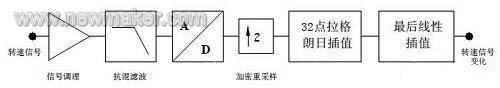 達(dá)到上述采樣間隔后,利用可靠、精確的拉格朗日多項(xiàng)式插值法(16階),再進(jìn)行32倍插值。此時(shí),對(duì)原始轉(zhuǎn)速信號(hào)的估計(jì),達(dá)到76ns的時(shí)間分辨率。而最初的ADC采樣率為204.8KHz(4.9ms的時(shí)間分辨率)。最后,對(duì)拉格朗日插值后的采樣信號(hào)再進(jìn)行檢測(cè),查找其“+”、“-”值的轉(zhuǎn)換點(diǎn),并用線性插值法確定精確的過(guò)零時(shí)刻。由于最后一步的線性插值是在超高的過(guò)采樣后進(jìn)行的,可以認(rèn)為輸入數(shù)據(jù)具有極好的線性度,它有效地保證了最佳的RPM精度。仿真處理表明,理論上,QTV處理的時(shí)間分辨率等效于工作在幾個(gè)GHz的計(jì)數(shù)器。