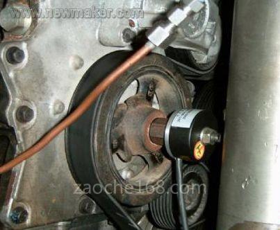 為了克服上述缺點(diǎn),我們采用長(zhǎng)春第一光學(xué)有限公司生產(chǎn)的ZKT-56A-120B-G12E型光電編碼器。該光電編碼器每轉(zhuǎn)輸出120個(gè)脈沖,采用通孔形式,用鍵槽固定。整個(gè)編碼器的質(zhì)量<0.1kg。為了與曲軸前端連接,采用一個(gè)兩端螺紋的螺栓,一端直接與曲軸螺紋孔相連,另一端用于固定光電編碼器,因此在現(xiàn)場(chǎng)安裝非常方便。
