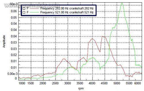 3 利用發(fā)動(dòng)機(jī)扭振階次圖可以清楚地判定曲軸的共振階次,共振振幅。