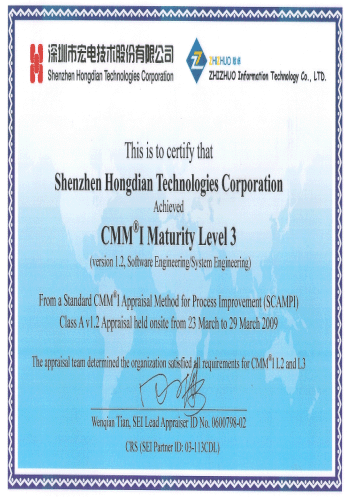 宏電公司順利通過了CMMI三級評估認(rèn)證, 并獲得由SEI(美國卡納基--梅隆大學(xué)軟件工程研究所)授權(quán)簽署和頒發(fā)的CMMI 軟件工程和系統(tǒng)工程成熟度3級證書。至此,深圳宏電成為業(yè)內(nèi)同時(shí)獲得ISO9001:2000和CMMI三級質(zhì)資的M2M行業(yè)終端及整體解決方案供應(yīng)商。