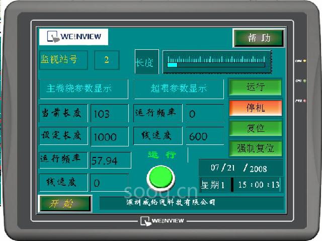 在WEINVIEW MT6000觸摸屏的主界面上,實時顯示當(dāng)前通訊變頻器的各項主要參數(shù),并用精美的圖形實時顯示變頻器的當(dāng)前狀態(tài),分為:停機(jī)、運行、故障等多檔指示。同時利用棒圖元件形象直觀地實時顯示了當(dāng)前變頻器的長度參數(shù)。