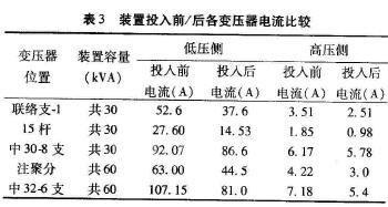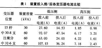 (1)集中補(bǔ)償時:通過現(xiàn)場采集的數(shù)據(jù)計算,可得出表1中所示的低壓側(cè)與高壓側(cè)在投人裝置前、后所對應(yīng)的電流值。