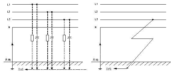 圖1 線路正常時(shí)絕緣電阻及分布電容對(duì)地漏電示意 圖2 線路非正常對(duì)地漏電示意