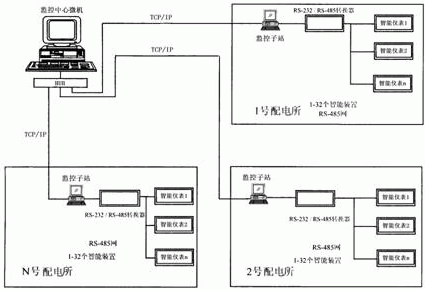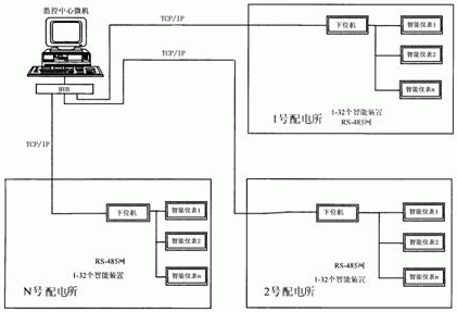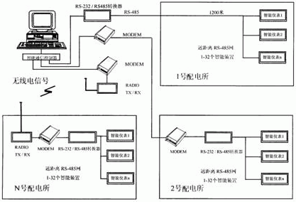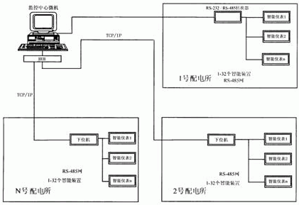 圖1 一臺中央控制機和每個配電所安裝1-32個智能儀表
