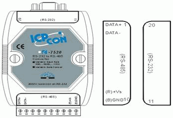 由于RS-232與RS-485所采用的IC不一樣,它們之間的信號標(biāo)準(zhǔn)電位也不相同,如果希望能使用RS-232去進行RS-485的控制,就必須將RS-232的標(biāo)準(zhǔn)電位做轉(zhuǎn)換。本系統(tǒng)選用泓格科技出品的分布式模塊ICP-CON的I-7520進行RS-232與RS-485的信號轉(zhuǎn)換。
