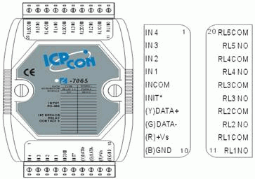 實現(xiàn)監(jiān)控最基礎(chǔ)的便是應(yīng)用數(shù)字輸入/輸出來檢測外界狀態(tài)和控制開關(guān),我們在系統(tǒng)中選用了臺灣鴻格科技的I-7065,作為數(shù)字輸入/輸出模塊,實現(xiàn)對現(xiàn)場開關(guān)量的采集和控制。I-7065是5通道繼電器輸出/4通道數(shù)字量輸入模塊。如圖7所示。