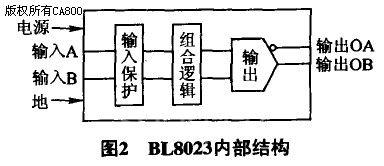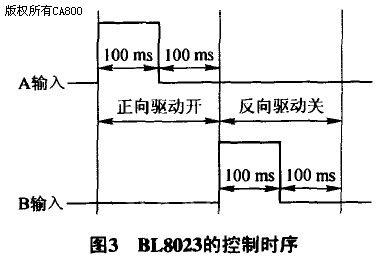 當(dāng)一個系統(tǒng)只用幾個磁保持繼電器時,可采用BL8023實現(xiàn)簡單驅(qū)動。BL8023是雙向繼電器驅(qū)動集成電路,用于控制磁保持繼電器的工作,具有輸出電流大,靜態(tài)功耗小的特點,其內(nèi)部結(jié)構(gòu)框圖如圖2所示。BL8023的輸入端A、B源于I/O口脈沖信號控制,該脈沖信號的寬度及脈沖間隔保持100 ms左右,BL8023的輸出端OA和OB接磁保持繼電器線圈,BL8023的控制時序如圖3所示??刂?只磁保持繼電器至少需要4條接線,電源線、地線、輸入線A~ 正向驅(qū)動、輸入線B一反向驅(qū)動(如圖2所示)。如果控制Ⅳ只磁保持繼電器至少需2Ⅳ條線,其中電源和地線公用,如果控制系統(tǒng)磁保持繼電器數(shù)量較多時,會有引線數(shù)量較大、控制電路體積較大的弊端。