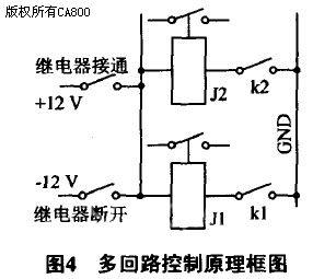 如果控制系統(tǒng)有大量的磁保持繼電器需要控制時,需要注意結(jié)構(gòu)組裝等條件限制,為了實現(xiàn)接線簡單、結(jié)構(gòu)緊湊、控制板模塊化,需對控制電路進(jìn)行優(yōu)化設(shè)計。在JXD-240型限電計費裝置中,采用了如圖4所示的控制原理:當(dāng)某個磁保持繼電器需要動作時(接通或斷開),首先將對應(yīng)的開關(guān)K接通。這時磁保持繼電器的一端與電源地線相連,而另一端與浮動的電源總線相連。如果浮動的電源總線與+12 V相連,則繼電器實現(xiàn)接通動作;如果浮動的電源總線與-12 V相連,則繼電器實現(xiàn)斷開動作。脈沖寬度和脈沖之間最小間隔,仍然保持100 ms以上。采用這種結(jié)構(gòu),幟繼電器只需Ⅳ+1條連線。