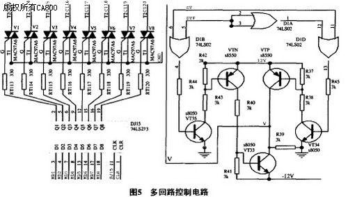 為了實現(xiàn)圖4所示的控制,采用了如圖5所示的具體電路。8D觸發(fā)器74LS273輸出的每bit位可控制一只繼電器。當(dāng)273某一輸出腳為高電平時,其輸出短路驅(qū)動電流可以達(dá)到60mA.磁保持繼電器采用BST一902型,其額定電流為80mA,而可控硅MAC97A6是電流控制型,實際的觸發(fā)電流應(yīng)是負(fù)載電流的1/10至1/3之間。由于器件一致性較差,為了保證批量生產(chǎn)的成品率,應(yīng)取最低指標(biāo)進(jìn)行設(shè)計。這樣I/O口高電平可使雙向可控硅可靠導(dǎo)通,由于雙向可控硅導(dǎo)通后等效成一只無觸點開關(guān),使繼電器的一端與地接通,這時電源輸出端只要加上相應(yīng)電壓就會使繼電器產(chǎn)生相應(yīng)的閉合、斷開動作。