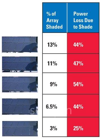 如上所述,在光伏系統(tǒng)中,太陽能電池板是由多個(gè)串聯(lián)組并聯(lián)后形成的。就像節(jié)日燈飾一樣,假如串聯(lián)中的任何某個(gè)電池發(fā)生故障,就會(huì)導(dǎo)致整個(gè)電池組失效。此外,當(dāng)有局部陰影或碎礫等遮蔽光伏系統(tǒng)時(shí),這種情況也會(huì)發(fā)生。