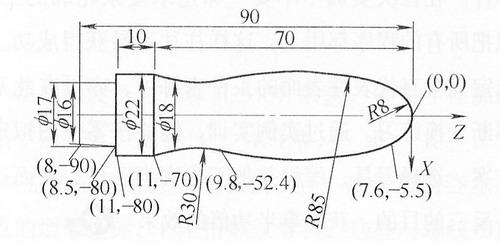 (4) 還應(yīng)考慮按粗、精加工劃分工序,若采用整個(gè)輪廓循環(huán)程序,編程雖然簡單,但前幾個(gè)循環(huán)中的空程太多,不利于發(fā)揮數(shù)控加工的高效率。故對右端R8mm球頭先用車錐法粗車、再同中部R30mm凹弧處用循環(huán)程序粗車。粗加工切除大部分余量后,再將其表面精車一遍,以保證加工精度和表面粗糙度的要求。