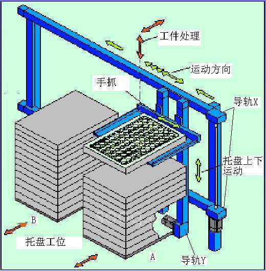 在很多產品的生產過程中,用來完成一些生產工序,不僅能提高生產效率,降低成本,更能提高產品質量。例如在ESTEE LAUDER公司的唇膏生產過程中,要把唇膏和殼從一拖盤取出,再把唇膏整潔準確地裝入殼內,并蓋好蓋及擰緊,最后把成品唇膏放另一拖盤中。還有在許多手機生產過程中,在一個托盤上整齊地放置一些裝有手機外殼、印刷電路板、用塑料帶包裝好的顯示部件。機器手爪把它們一個一個地抓取到傳送帶上,以便進行下步處理,并在最后把已經空的托盤搬到空托盤摞上。這類碼垛被廣泛應用在醫(yī)藥、包裝,裝配,生產等眾多行業(yè),因其結構和工作原理非常類似,而且都以直角坐標為基礎,所以本文先簡介直角坐標,再介紹標準碼垛及一應用案例。
