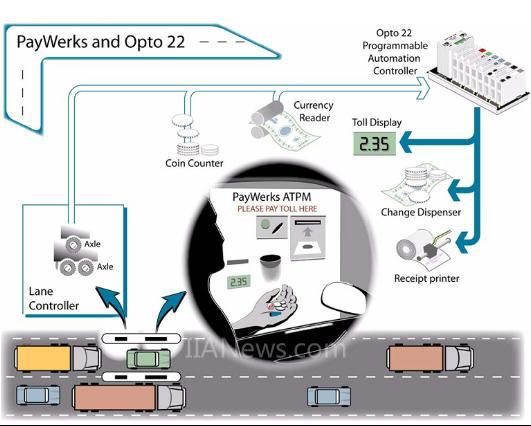 PayWerks公司制造先進的收費機器(ATPM)—一種戶外收費亭,用于收費公路,方便顧客使用紙幣、硬幣等現(xiàn)金支付,并找零。ATPM機提供兩個水平高度接受現(xiàn)金和硬幣(一般參照“Miata”和“SUV”)同時可以打印交易回執(zhí)。PayWerks將Opto 22的可編程自動化控制器作為ATPM機的核心組件嵌入其系統(tǒng)。