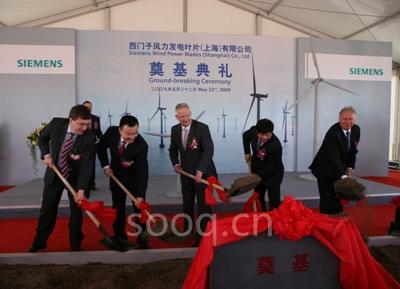 中國上海, 2009年5月22日,西門子在華首家風機設備制造廠——西門子風力發(fā)電葉片(上海)有限公司今天在上海臨港區(qū)破土動工,作為積極拓展其全球風機生產網絡的重要舉措,此舉標志著西門子正式進軍中國風電市場。西門子風力發(fā)電葉片(上海)有限公司的初期投資為5.81億元人民幣(6400萬歐元);工廠計劃于2010年下半年投入運營,屆時將更好的滿足中國及出口市場對風機設備的大量需求。上海市副市長艾寶俊、西門子股份公司管理委員會成員兼能源業(yè)務領域首席執(zhí)行官戴恩和西門子東北亞業(yè)務區(qū)首席執(zhí)行官、西門子(中國)有限公司總裁兼首席執(zhí)行官郝睿強博士共同為工廠奠基。