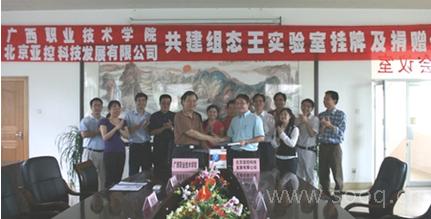 2009年5月20日,北京亞控科技發(fā)展有限公司校企合作計劃走到廣西南寧,與廣西職業(yè)技術學院在該校會議室隆重舉行了“共建組態(tài)王實驗室”掛牌及捐贈儀式。廣西職業(yè)技術學院副院長覃洪斌、電子工程機械系黨總支書記李建春、系主任盧勇威、教研室主任覃貴禮等校方領導和亞控科技廣州分公司經理韓結榮先生在儀式上就合作模式、未來發(fā)展以及高校畢業(yè)生所關注的就業(yè)與發(fā)展等問題進行了深入交流和探討。