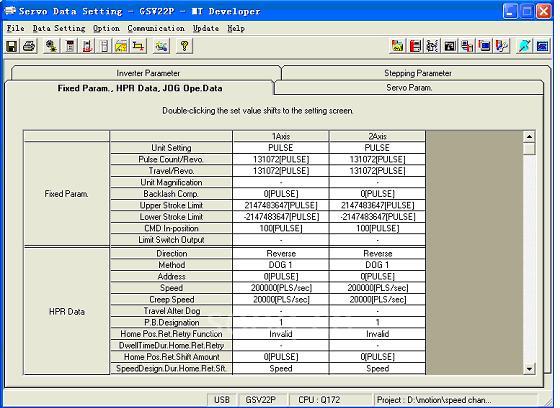 如果有必要,還可以根據(jù)需要進行共享參數(shù)設(shè)置,比如系統(tǒng)中有觸摸屏?xí)r,就可以在觸摸屏上設(shè)定指定軸的速度,通過共享參數(shù)刷新到運動控制器中去,再通過在運動控制器的CHGV中使用被刷新的新速度值存儲軟元件就可以改變指定軸的轉(zhuǎn)速了,如果系統(tǒng)中有AD模塊,也可以用外部模擬量來控制指定軸的轉(zhuǎn)速。