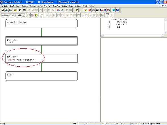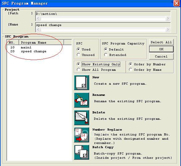 共有兩個SFC程序,main1為定位主程序,speed change為改變速度的程序