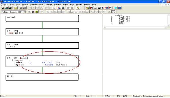 則上電運行后兩個程序都被激活,如果此時將X0置為ON這可以啟動main1的定位運動,在定位的過程中如果再將X1置為ON,則可將正在進行的定位運動的速度由65536PLS/sec改變成131072PLS/sec,速度提高一倍(新速度值也可以間接指定)。