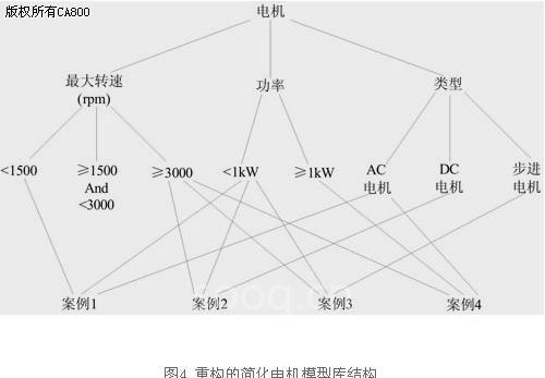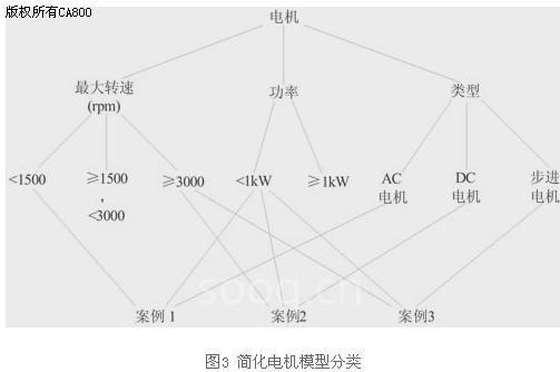 在這個(gè)模型庫(kù)中,機(jī)電系統(tǒng)和部件的模型可以分為幾個(gè)主要部分,如機(jī)械,電子電氣,液壓等。這些分類組建成一個(gè)樹型結(jié)構(gòu)。例如,電子電氣組件可以分為微處理器,執(zhí)行器,驅(qū)動(dòng)系統(tǒng),傳感器等。進(jìn)一步,執(zhí)行器還可按照不同的類型,功率,最大轉(zhuǎn)速,驅(qū)動(dòng)方式等再進(jìn)行分類。圖3給出了一個(gè)簡(jiǎn)化的電機(jī)分類的例子。其中案例1代表模型庫(kù)中的一個(gè)原始模型。