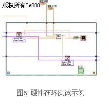 通過使用虛擬儀器技術(shù),硬件在環(huán)測(cè)試系統(tǒng)的實(shí)現(xiàn)變的越來越容易。圖5是一個(gè)硬件在環(huán)測(cè)試實(shí)現(xiàn)的具體例子。這個(gè)程序采用LabVIEW實(shí)現(xiàn),一個(gè)采用傳遞函數(shù)描述的數(shù)學(xué)模型嵌入了測(cè)試的過程,從而實(shí)現(xiàn)了實(shí)際系統(tǒng)和數(shù)學(xué)模型混合的硬件在環(huán)測(cè)試流程。