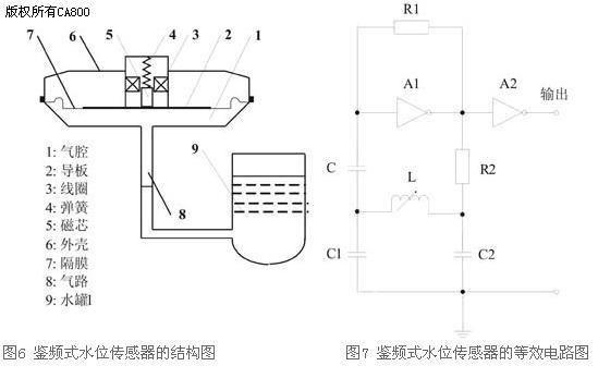 鑒頻式水位傳感器的結(jié)構(gòu)見圖6。它采用LC電磁諧振電路作為敏感元件,將水位信號(hào)轉(zhuǎn)變成LC參數(shù)變化,最后輸出頻率信號(hào)。原理可以簡(jiǎn)單描述如下:水位首先影響在氣腔內(nèi)的氣壓,氣壓的改變使導(dǎo)板運(yùn)動(dòng),磁芯也就在線圈中移動(dòng),這就改變了線圈的電感,最終LC電路產(chǎn)生了不同的頻率信號(hào)。鑒頻式水位傳感器的等效電路見圖7。
