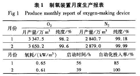 津西15000 m3/h制氧項(xiàng)目已完成投運(yùn),其中空氣壓縮機(jī)、氧氣壓縮機(jī)、氮?dú)鈮嚎s機(jī)、冷水機(jī)組、預(yù)冷控制系統(tǒng)、空氣純化系統(tǒng)等自動(dòng)化投運(yùn)率都已達(dá)到100% ,目前裝置運(yùn)行平穩(wěn)、正常,表1為生產(chǎn)月度統(tǒng)計(jì)報(bào)表。空分制氧技術(shù)的多耦合、大滯后給自動(dòng)控制造成了很大難度,如何進(jìn)一步改善精餾控制系統(tǒng)穩(wěn)定性,提高產(chǎn)品提取率,降低單位產(chǎn)品的消耗,將是國(guó)內(nèi)空分自控行業(yè)需要進(jìn)一步解決的課題。