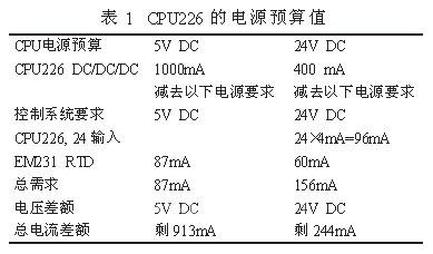 CPU 還向外提供一個(gè)24V 直流電源, 從電源輸出點(diǎn)(L+,M) 引出。此電源可為CPU和擴(kuò)展模塊上的I/0 點(diǎn)供電,也為一些特殊或智能模塊提供電源。電源預(yù)算值見表1。由表1 中數(shù)據(jù)可知: 電源容量完全滿足要求, 無須增加外接電源。