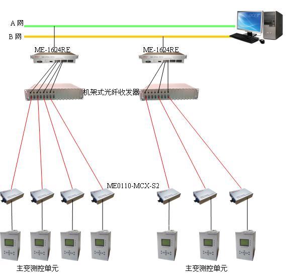 在設(shè)備選用上,甲方選擇了ME0110-MCX-S2和ME0110-MCX-K兩種,其中間隔層設(shè)備全用臺式的ME0110-MCX-S2,控制室則全部使用集中插卡式的ME0110-MCX-K??刂剖业牟蹇ㄓ梢粋€2U機箱集中供電,2U機箱提供雙電源輸入,極大地保證了運行的安全性。