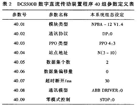 從站為DCS500B時(shí),應(yīng)首先定義FIELDBUS功能塊。主要定義參數(shù)有:模塊類型、通訊模塊、從站站號(hào)、波特率、傳送字號(hào)等(表2)。通過(guò)對(duì)DCS500B通訊參數(shù)的組態(tài),可以與主站進(jìn)行數(shù)據(jù)通訊,也可以通過(guò)主站與其它從站進(jìn)行數(shù)據(jù)通訊。