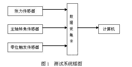 如圖1所示,本系統(tǒng)測(cè)量時(shí)將轉(zhuǎn)速傳感器、定位傳感器、張力傳感器的輸出分別接至采集卡的三路模擬輸入通道,用CVI軟件編程采集數(shù)據(jù),將張力隨轉(zhuǎn)角變化的波形顯示在計(jì)算機(jī)屏幕上。