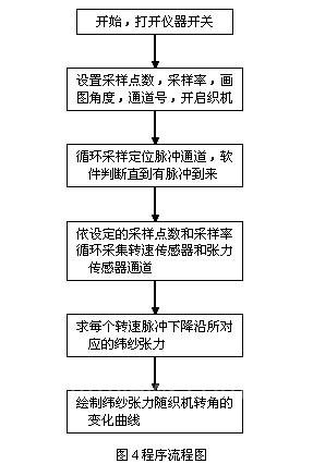 本測(cè)量共用三個(gè)模入通道,首先啟動(dòng)所設(shè)計(jì)好的儀器,開(kāi)啟織機(jī),零位觸發(fā)傳感器作為織機(jī)零度標(biāo)志,采集到零位信號(hào)后,利用主軸光柵脈沖觸發(fā),對(duì)張力傳感器的輸出進(jìn)行采樣,按預(yù)定的采樣點(diǎn)數(shù)采集結(jié)束后,經(jīng)標(biāo)定可得到動(dòng)態(tài)情況下緯紗張力隨織機(jī)轉(zhuǎn)角變化,用CVI編寫(xiě)的程序流程圖如圖4所示,所設(shè)計(jì)的界面及測(cè)試結(jié)果如圖5所示。