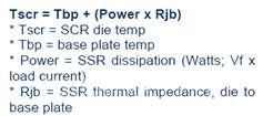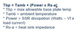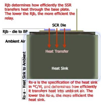 一個(gè)安裝在散熱器上的固態(tài)繼電器既有外部阻抗也有內(nèi)部阻抗。兩者主要的區(qū)別在于客戶可以通過(guò)調(diào)整散熱器尺寸和改變環(huán)境溫度和氣流等等來(lái)控制外部阻抗(Rs-a)。內(nèi)部阻抗,無(wú)論如何,只能通過(guò)固態(tài)繼電器設(shè)計(jì)與結(jié)構(gòu)決定。制造商提供這個(gè)規(guī)格作為Rjb (熱變電阻,結(jié)溫(SCR)對(duì)基座平板),并且測(cè)量,如同散熱器,(oC單位瓦特消散量)。