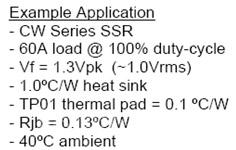 通過(guò)使用以上公式,我們開始估計(jì)固態(tài)繼電器內(nèi)部可控硅(SCR)硅片的在給定應(yīng)用參數(shù)下的實(shí)際溫度。舉例,假設(shè)我們90A CWD系列固態(tài)繼電器在阻性加熱應(yīng)用設(shè)備中,帶動(dòng)60安培的負(fù)載電流。假定環(huán)境溫度40度,滿載以及1.0oC/W的散熱器為例。CW系列固態(tài)繼電器的常規(guī)壓降為1.0Vrms,并且90安培的CW的結(jié)溫Rjb是0.13oC/W(參照規(guī)格書)。需要注意的是規(guī)格書中的壓降是電壓的峰值。我們轉(zhuǎn)換這RMS值我們轉(zhuǎn)換此成RMS值計(jì)算功率耗散,在這種情況下是1.3Vpk或0.9Vrms。然而,簡(jiǎn)單來(lái)說(shuō)我們用1W/amp來(lái)計(jì)算。它留給我們一些余量,更重要的是便于計(jì)算。