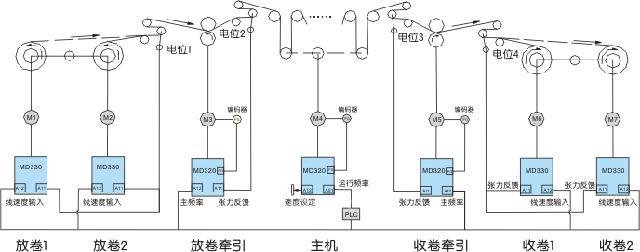 系統(tǒng)由七臺(tái)電機(jī)進(jìn)行變頻傳動(dòng)控制,分別為兩臺(tái)放卷(MD330)、兩臺(tái)收卷(MD330)、主機(jī)(MD320)一臺(tái)和收、放卷牽引(MD320)各一臺(tái)構(gòu)成,其中收卷、放卷、收放卷牽引都是帶張力反饋的閉環(huán)張力控制,變頻器工作在速度模式;由于兩級(jí)牽引中間是印刷單元,對(duì)套色精度有很高的要求,因而對(duì)張力調(diào)節(jié)的穩(wěn)定性要求很高,所以主機(jī)和兩級(jí)牽引采用帶編碼器的閉環(huán)矢量控制,如圖所示: