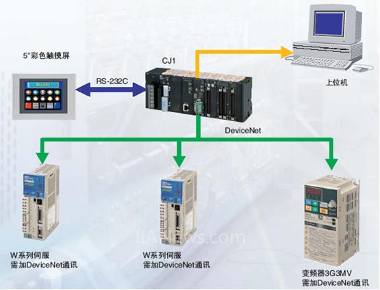在絲桶往復控制系統(tǒng)上,我們選取了歐姆龍的中型PLC CJ1系列,采用DeviceNet現(xiàn)場總線作為控制系統(tǒng)。縱向、橫向運動部件由歐姆龍的OMNUC W 系列AC伺服電機控制;變頻器3G3MV控制出桶電機。系統(tǒng)還配有NS的觸摸屏作為現(xiàn)場人機對話界面,并可根據(jù)用戶需要通過以太網(wǎng)連接上位機。