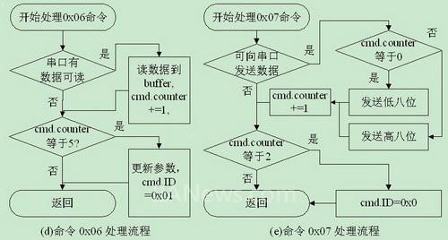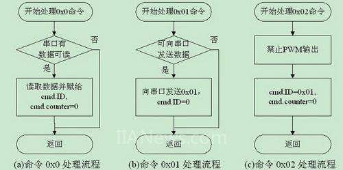 圖3中列出了幾種典型命令字的處理流程,它們均為圖2所示流程圖的一部分。圖3(a)中為0,表示當(dāng)前無命令字,程序?qū)L試從串口讀取數(shù)據(jù),這樣一旦有新的命令字,程序便可以馬上獲知。圖3(b)中所示為為0x01時的處理流程,此時表明上位機(jī)在測試通信是否正常,如果可以向串口發(fā)送數(shù)據(jù),則程序在發(fā)送完畢表示成功的數(shù)據(jù)0x01后將重新賦值為0;否則,程序返回,這樣未被修改,中斷函數(shù)在下次運(yùn)行時仍會處理0x01命令字。圖3(c)為處理0x02命令字的流程,根據(jù)預(yù)先規(guī)定0x02對應(yīng)的指令是禁止PWM輸出,當(dāng)為0x02時,修改相應(yīng)的寄存器,禁止PWM輸出,之后由于要向上位機(jī)發(fā)送執(zhí)行成功的信號,也就是發(fā)送0x01,因此最后將的值修改為0x01(命令字0x01會在執(zhí)行完畢后將賦值為0)。這樣在下一次執(zhí)行通信服務(wù)函數(shù)的時候?qū)苯舆M(jìn)入0x01命令字分支。命令字0x03,0x04,0x05的處理流程與圖3(c)相似。