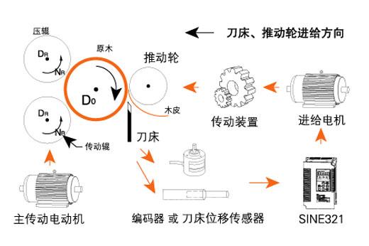 1.刀床進(jìn)給電機(jī)控制:SINE321系列木工旋切機(jī)專用變頻器,電流矢量控制,可選配PG卡,限位開(kāi)關(guān)。