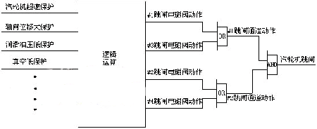 ETS是汽輪機(jī)緊急跳閘保護(hù)系統(tǒng)的簡稱。其功能是:當(dāng)汽輪機(jī)監(jiān)視的重要參數(shù)越限時,關(guān)閉汽輪機(jī)的主汽閥和調(diào)節(jié)汽閥,使汽輪機(jī)處于安全狀態(tài)。傳統(tǒng)的ETS系統(tǒng)由供電裝置、開關(guān)量變送器、繼電器、測速傳感器及轉(zhuǎn)換電路、跳閘電磁閥、試驗(yàn)電磁閥等組成。供電裝置向整個系統(tǒng)提供可靠的交、直流電源;開關(guān)量變送器用于測量汽輪機(jī)的重要參數(shù);跳閘電磁閥用于卸掉安全油和調(diào)節(jié)油的油壓,從而關(guān)閉汽輪機(jī)的主汽閥和調(diào)節(jié)汽閥;繼電器用來實(shí)現(xiàn)輸入信號的擴(kuò)展、隔離、邏輯運(yùn)算等功能,并驅(qū)動跳閘電磁閥和試驗(yàn)電磁閥,同時將引起跳閘動作的輸入信號送至SOE記錄裝置。圖1是ETS系統(tǒng)實(shí)現(xiàn)汽輪機(jī)保護(hù)功能示意圖。